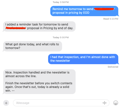 That's it! I send something like: "Schedule a roof inspection tomorrow with Mark at 123 West Street at 1 PM, and remind me to send a proposal by end of the day."